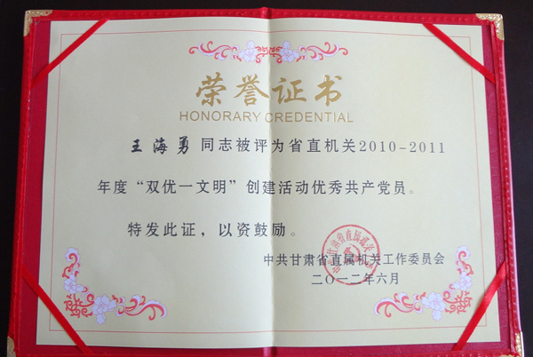 产品名称: 2012年6月王海勇同志被中共甘肃省直属机关工委评为“优秀共产党员 |