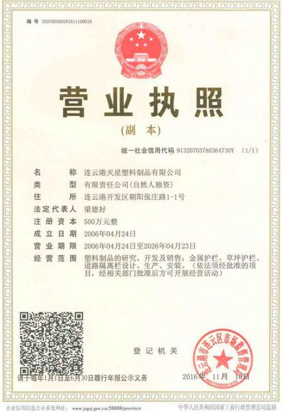 资质单位: 天星护栏(连云港天星塑料制品有限公司)