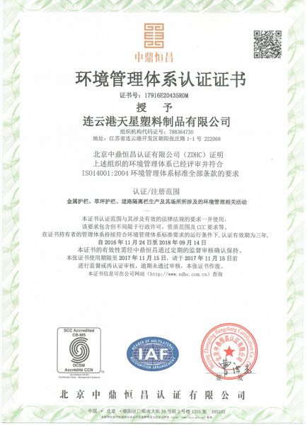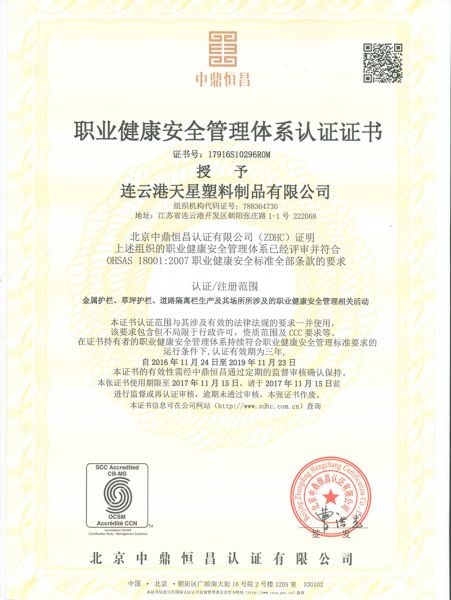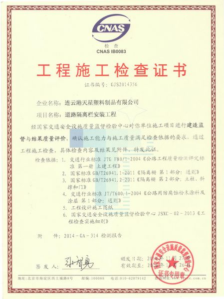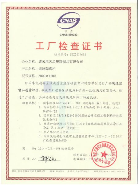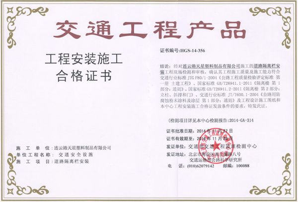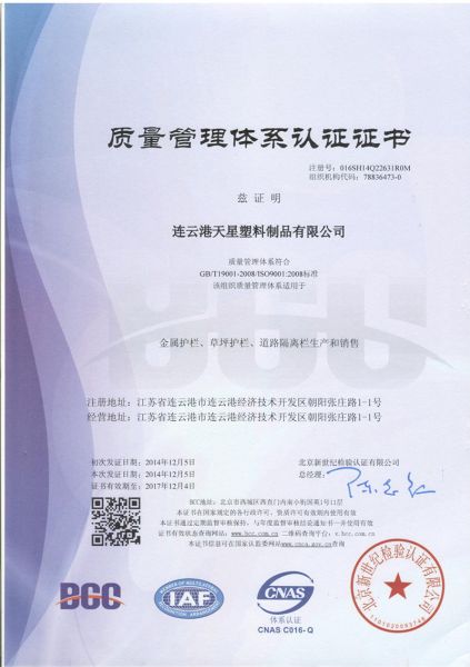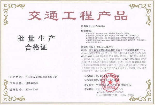 持证单位: 天星护栏(连云港天星塑料制品有限公司)